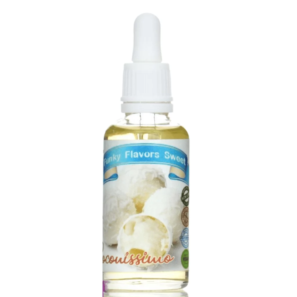 Funky Flavors Sweet Coconissimo to słodzony aromat spożywczy bez dodatku cukru! Krople smakowe idealnie sprawdzają się w dietetycznej kuchni – jako dodatek do ciast, owsianek, domowych lodów, koktajli, ciastek, omletów, naleśników i wielu innych smakołyków! Funky Flavors Sweet wyróżnia się zapachem i słodkim smakiem białej czekolady z kokosem!